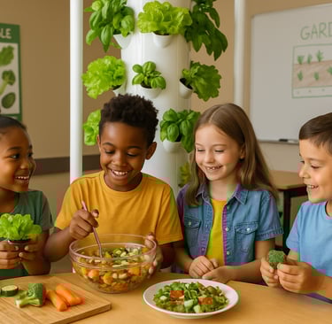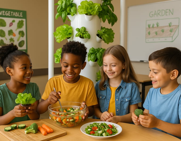 Middle schoolers manage hydroponic units, cook healthy meals, dive into nutrition science, and tackle food justice issues through group projects and presentations.